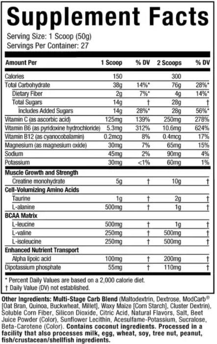 Cada porción de 49 g aporta 180 calorías, 38 g de carbohidratos y 3,5 g de creatina, con un rendimiento aproximado de 28 servicios por envase. La fórmula incluye ácido alfa lipoico (R-ALA) y está disponible en presentación de 3 libras (1,36 kg).