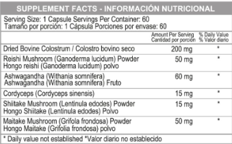 El Defense de Healthy America es un suplemento en cápsulas formulado con una combinación de colostro bovino seco, extractos de hongos medicinales y plantas tradicionales. Cada cápsula integra ingredientes seleccionados como reishi, ashwagandha, cordyceps, shiitake y maitake. El envase contiene 60 cápsulas, equivalente a 60 porciones.